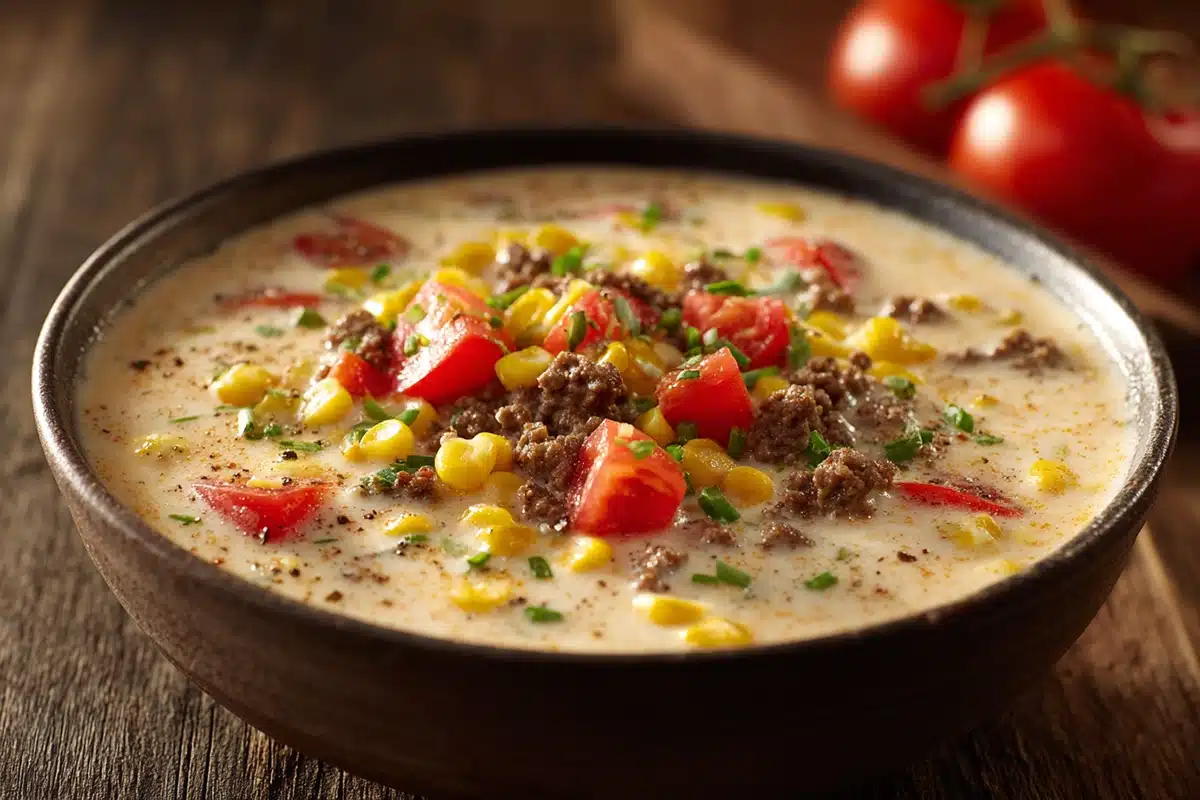 Creamy Cowboy Soup is a hearty Tex-Mex-inspired dish that combines seasoned ground beef, sweet corn, black beans, tender potatoes, and diced tomatoes, all simmered in a single pot. Finished with a swirl of cream and melty cheddar, it’s a cozy, one-pot meal perfect for busy nights. Bold smoky spices and creamy richness make this soup a family favorite.