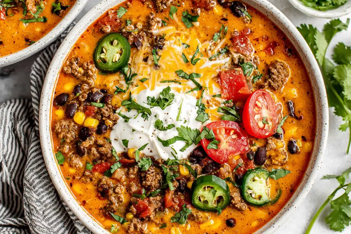 A hearty, creamy soup that combines seasoned ground beef, beans, corn, and tomatoes with a velvety broth enriched with cream cheese. Packed with zesty taco flavor, this comforting one-pot meal is ready in just 40 minutes and is perfect for busy weeknights or game day gatherings.
