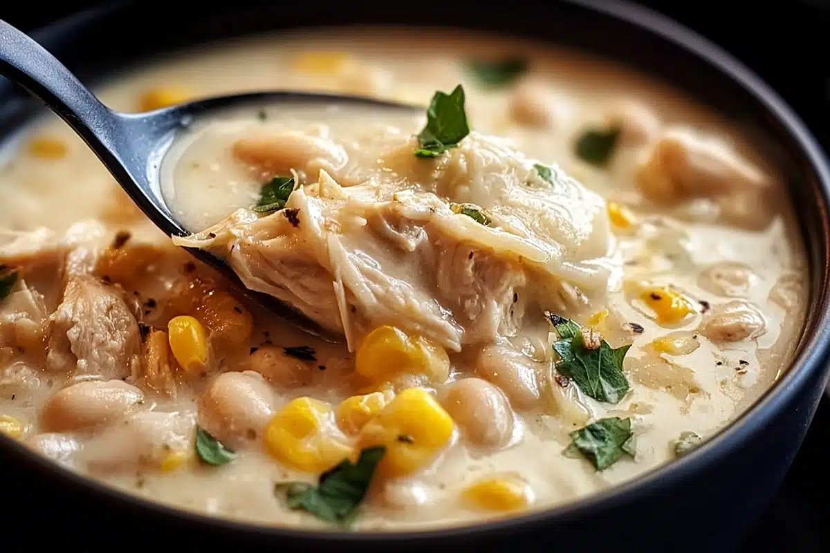 Add shredded chicken, white beans, and corn (if using). Simmer uncovered for 15–20 minutes to let the flavors mingle.