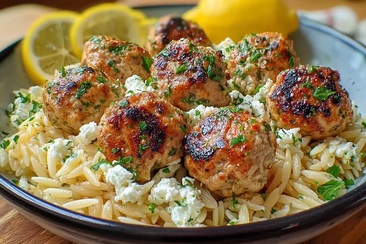 These Greek Chicken Meatballs with Lemon Orzo are a Mediterranean-inspired dinner that’s light yet comforting. Juicy, herby chicken meatballs are baked to golden perfection and paired with a zesty lemon orzo tossed with feta and fresh parsley. Ready in 45 minutes, this wholesome dish is perfect for busy weeknights, meal prep, or even entertaining.