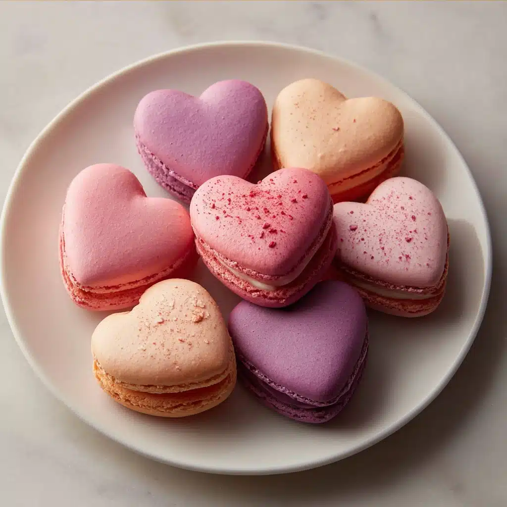 Heart-shaped macarons with crisp almond shells and a smooth vanilla buttercream filling, perfect for Valentine’s Day and special occasions.