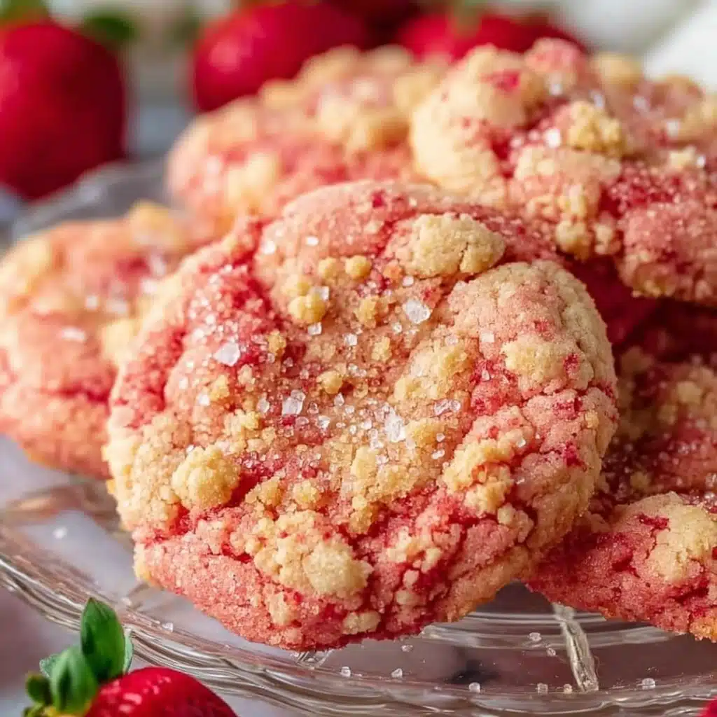 Soft and buttery Strawberry Crunch Cookies inspired by classic strawberry crunch ice cream bars, finished with a crisp cookie topping and bright strawberry flavor.
