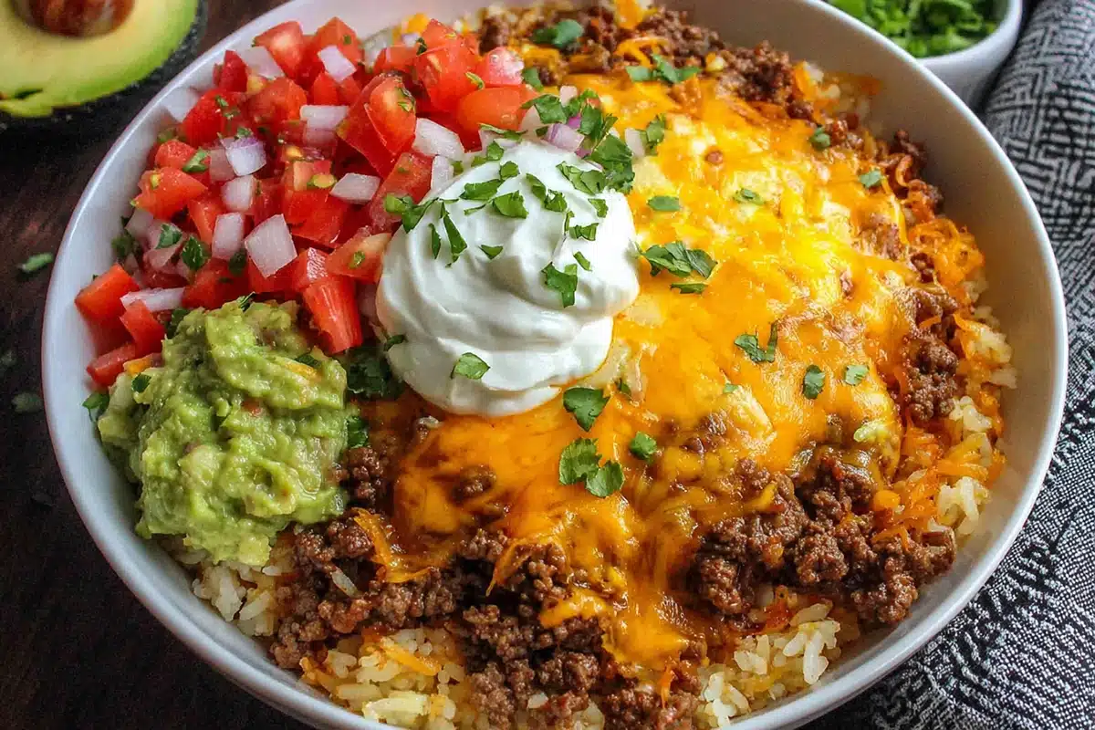 A quick and customizable Mexican-inspired dinner made with rice, seasoned ground beef, beans, corn, and fresh toppings. Perfect for busy weeknights, this taco rice bowl is hearty, flavorful, and fun to assemble.
