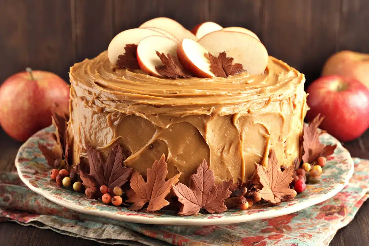 A rich and cozy fall dessert featuring moist cinnamon-spiced cake layers made with applesauce, diced apples, and caramel, all frosted with luscious salted caramel buttercream. Topped with mini caramel apples for a festive touch, this cake is a true autumn showstopper.